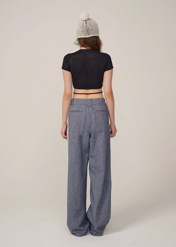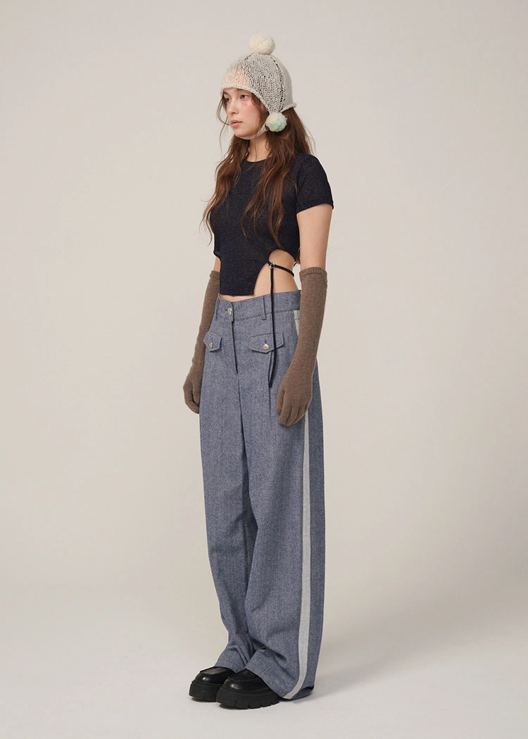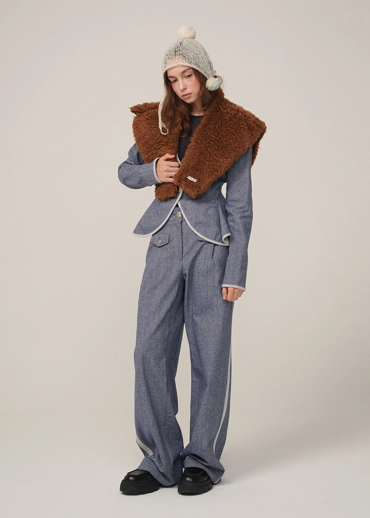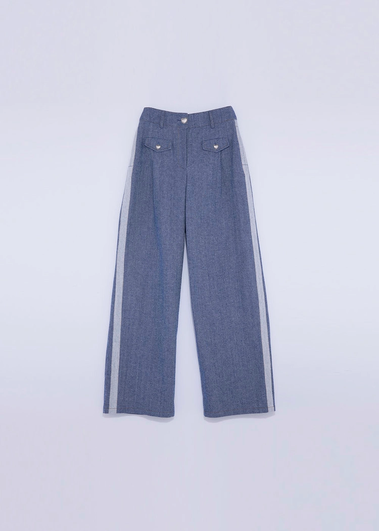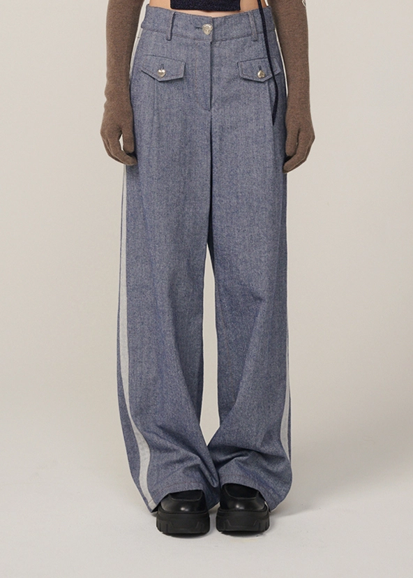 턱시도 팬츠처럼 옆라인이 포인트인 와이드 데님 팬츠입니다.