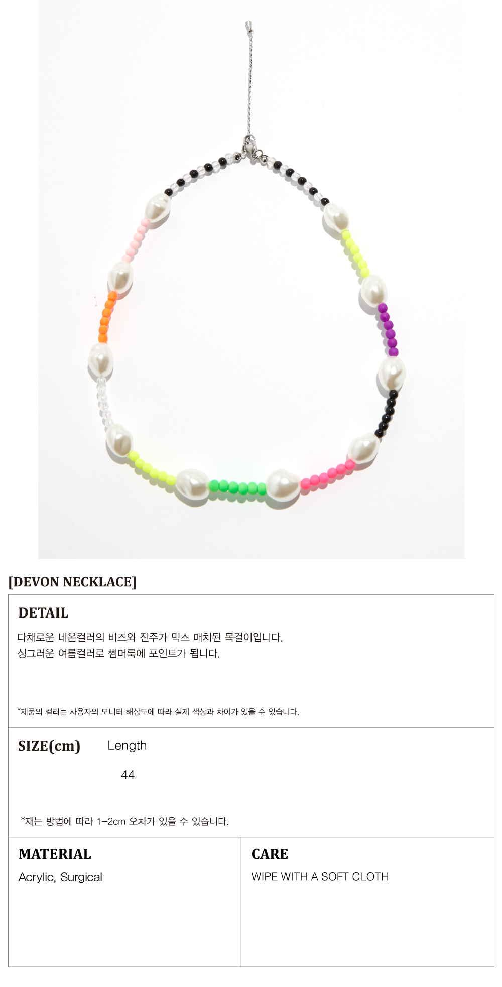 다채로운 네온컬러의 비즈와 진주가 믹스 매치된 목걸이입니다.