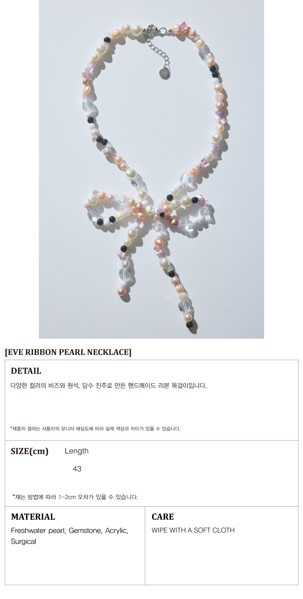 다양한 컬러의 비즈와 원석, 담수 진주로 만든 핸드메이드 리본 목걸이입니다.