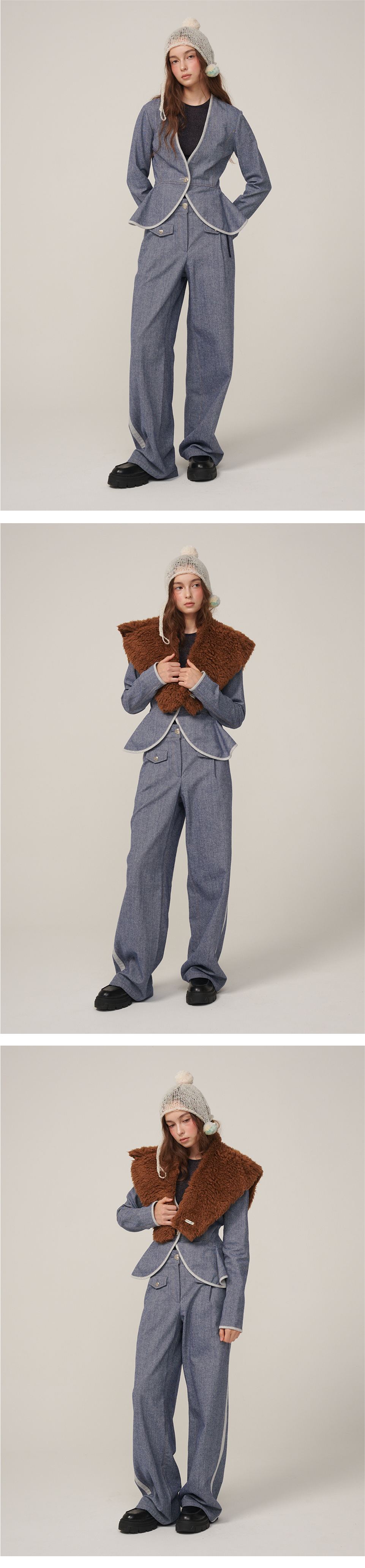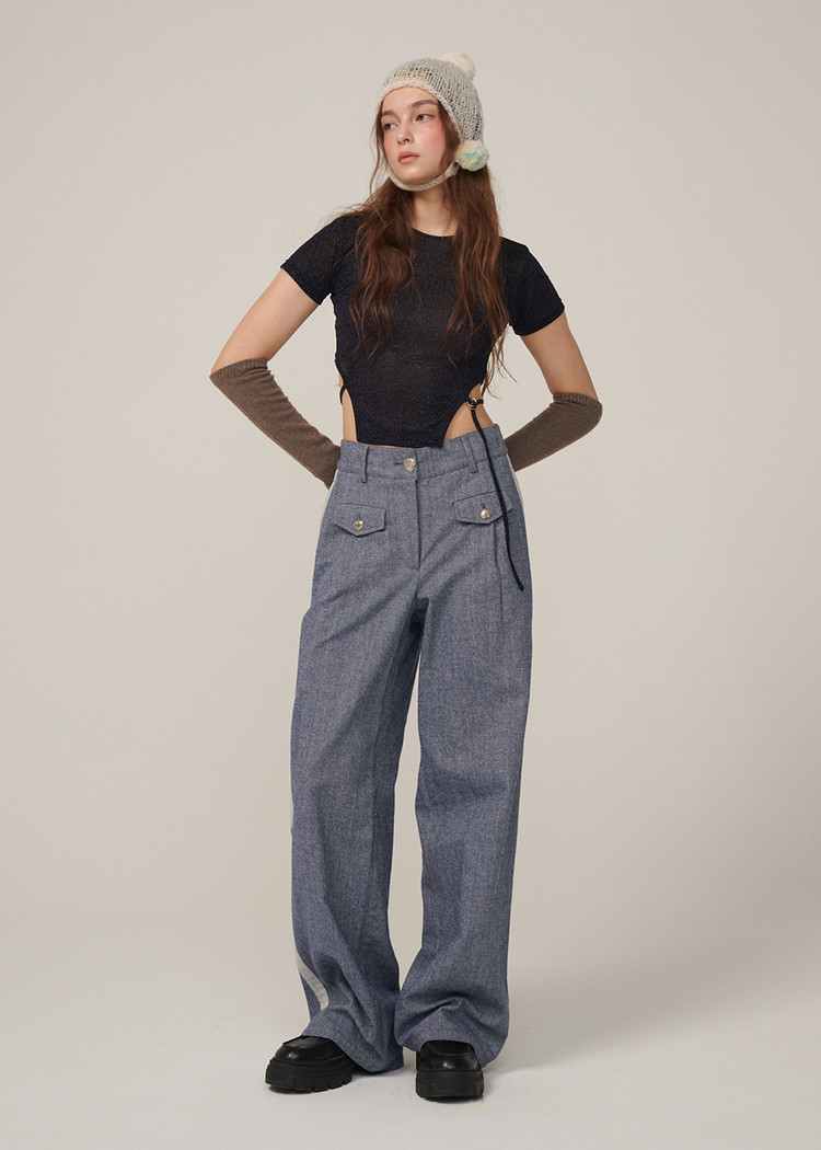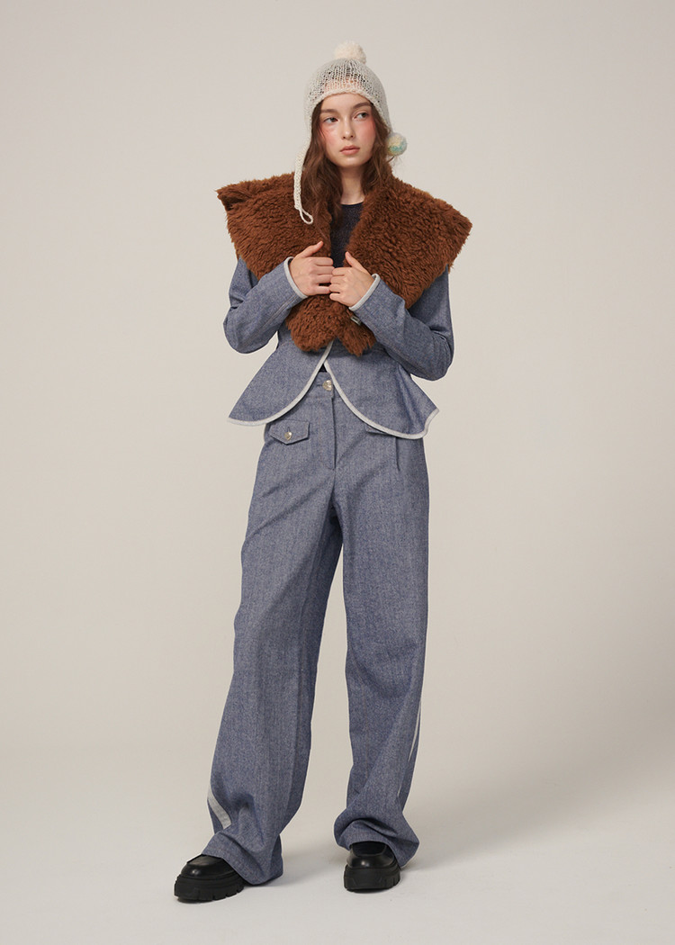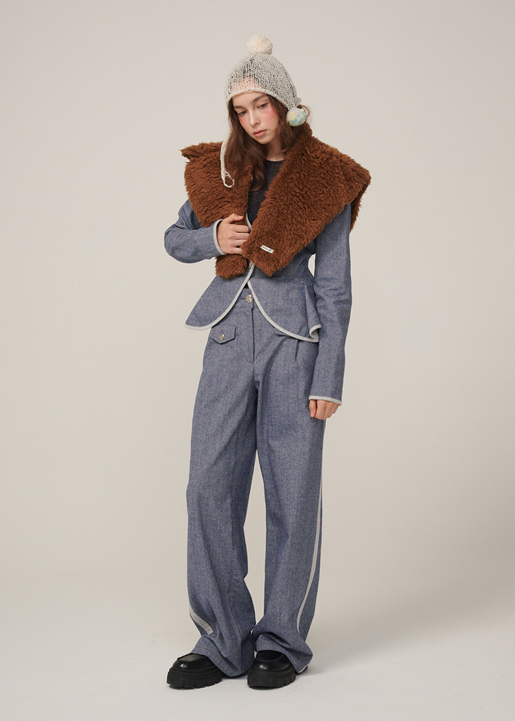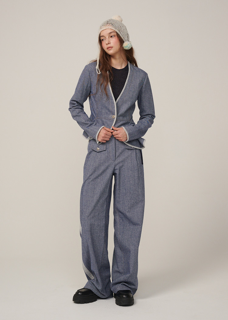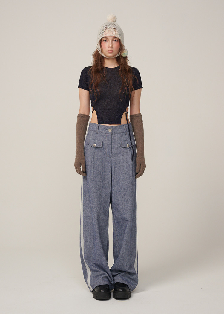 턱시도 팬츠처럼 옆라인이 포인트인 와이드 데님 팬츠입니다.