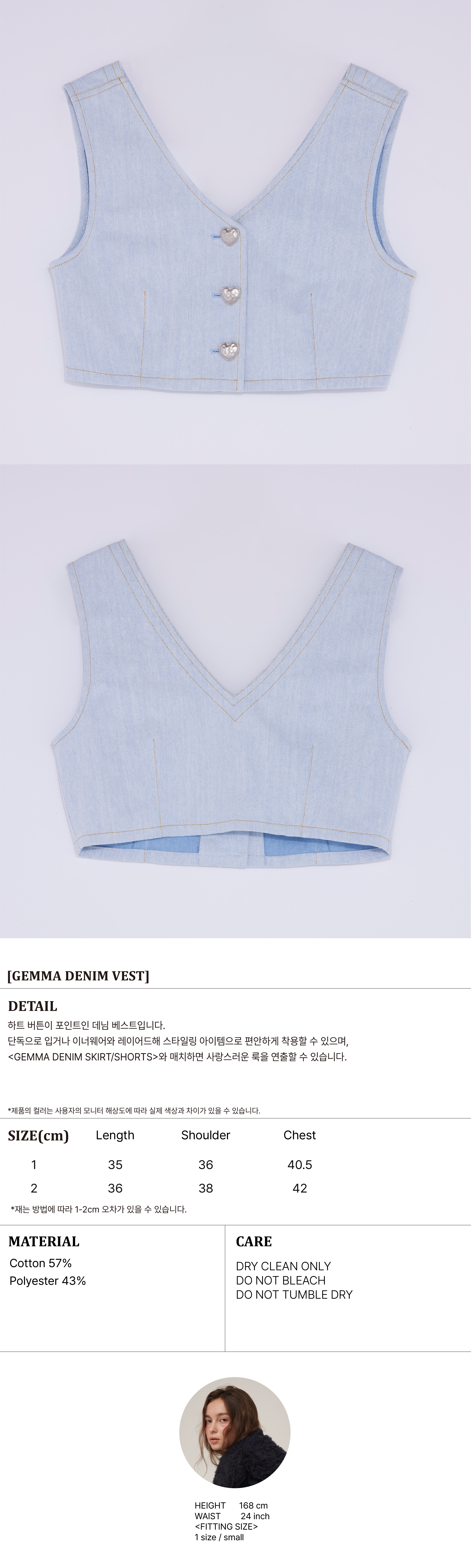 하트 버튼이 포인트인 데님 베스트입니다. 단독으로 입거나 이너웨어와 레이어드해 스타일링 아이템으로 편안하게 착용할 수 있으며, <GEMMA DENIM SKIRT/SHORTS>와 매치하면 사랑스러운 룩을 연출할 수 있습니다.