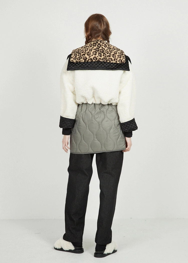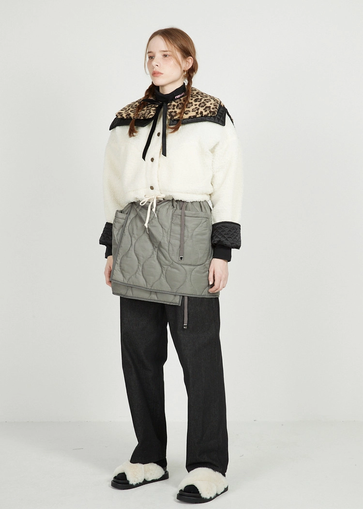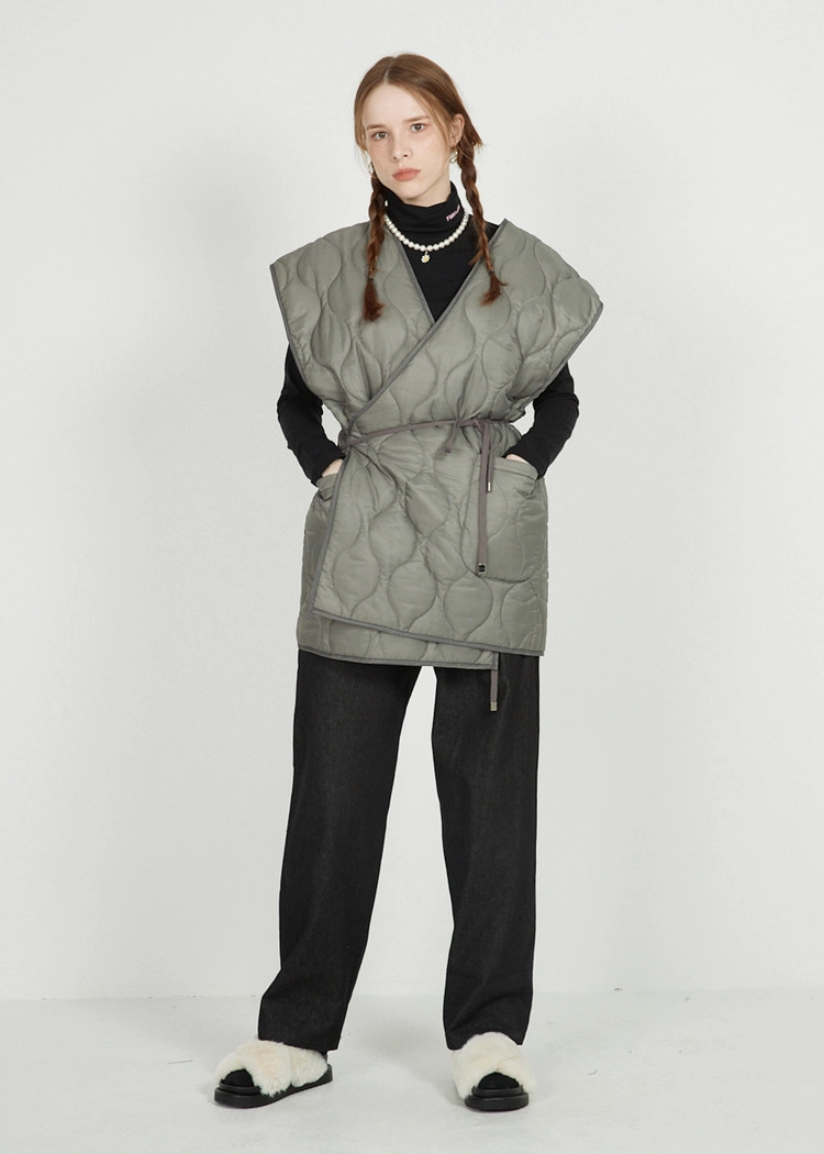광택 있는 폴리에스테르 100% 겉감에 충전 솜 4 OZ을 넣어 보온성을 강조한 패딩 베스트는 겉(그레이)과 안(카키)을 다 활용할 수 있는 리버서블 디자인으로, 옆에 달린 스트링을 활용해 벨트 대신 허리를 강조해 다양한 실루엣을 연출할 수 있습니다.